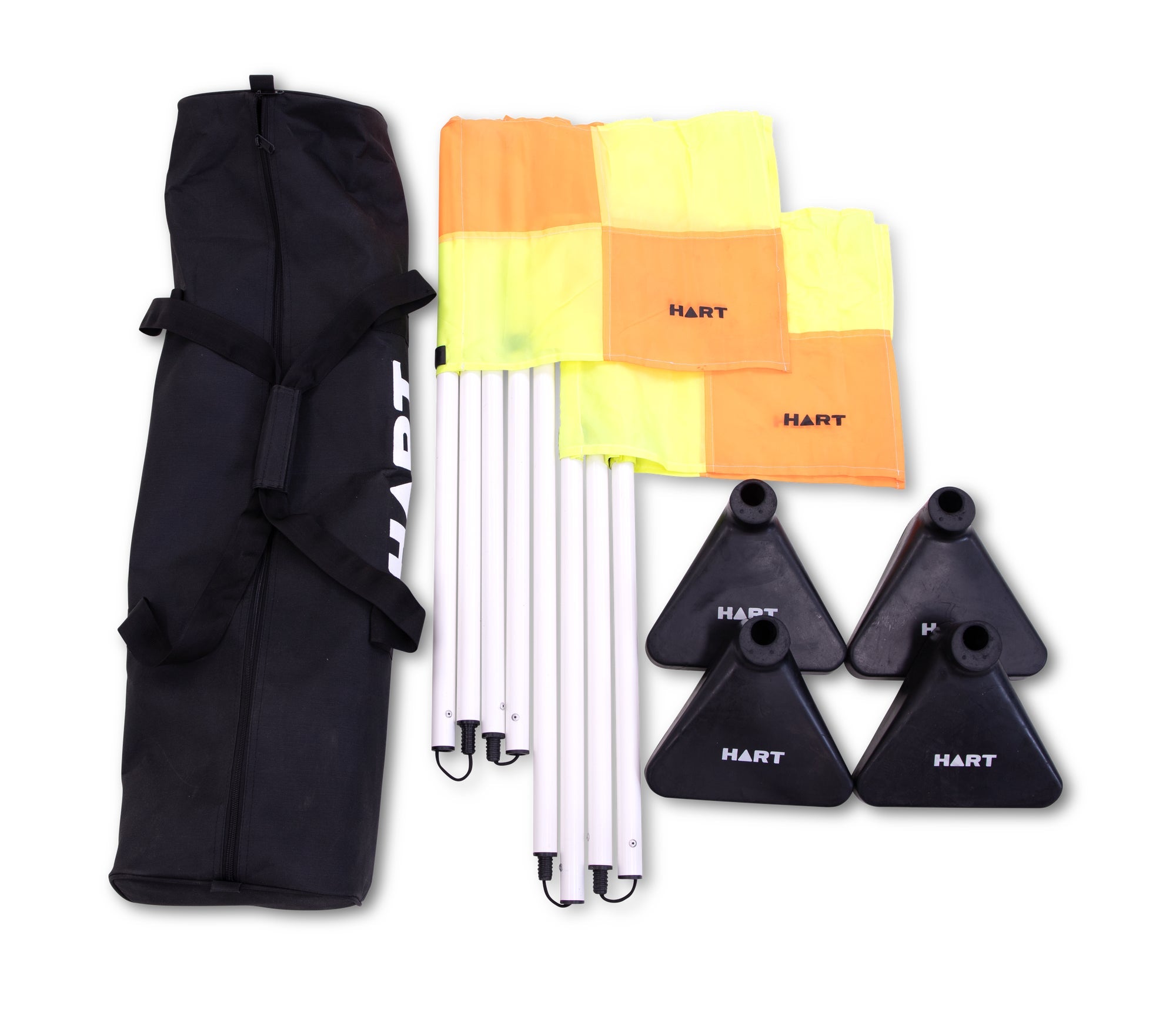 Durable and portable, the HART Free-Standing Corner Post Set is designed for quick setup on any surface. Featuring a sturdy triangular rubber base and two-piece pole with internal cord, it ensures stability and easy assembly. Supplied as a set of four with two-tone flags and carry bag for convenient transport and storage.